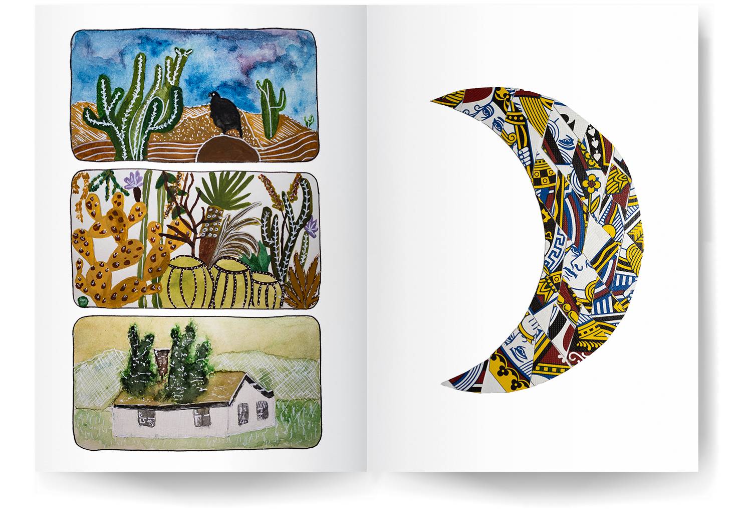 Using a white pen on my watercolour paintings is my favourite technique for creating striking visual effects against transparent paint layers. I also enjoy experimenting with collage, such as this crescent moon crafted by cutting face cards from a broken deck into diamond shapes.